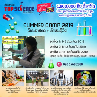 Top Science ຊຳເມີ້ແຄ້ມ ວິທະຍາສາດ 2019 ມາແລ້ວ ສຳລັບນ້ອງໆອາຍຸ 9 ຫາ 14 ປີ. ມ່ວນກັບການຮຽນ ແລະ ທົດລອງທາງວິທະຍາສາດ ທີ່ບໍ່ຄືໃຜ ແລະ ບໍ່ມີໃຜຄື, ພ້ອມກັບກິດຈະກຳທີ່ຫຼາກຫຼາຍ ທີ່ເນັ້ນການພັດທະນາທັກສະຊີວິດທີ່ນ້ອງໆຄວນມີຕິດຕົວ....ອ່ານເພີ່ມ